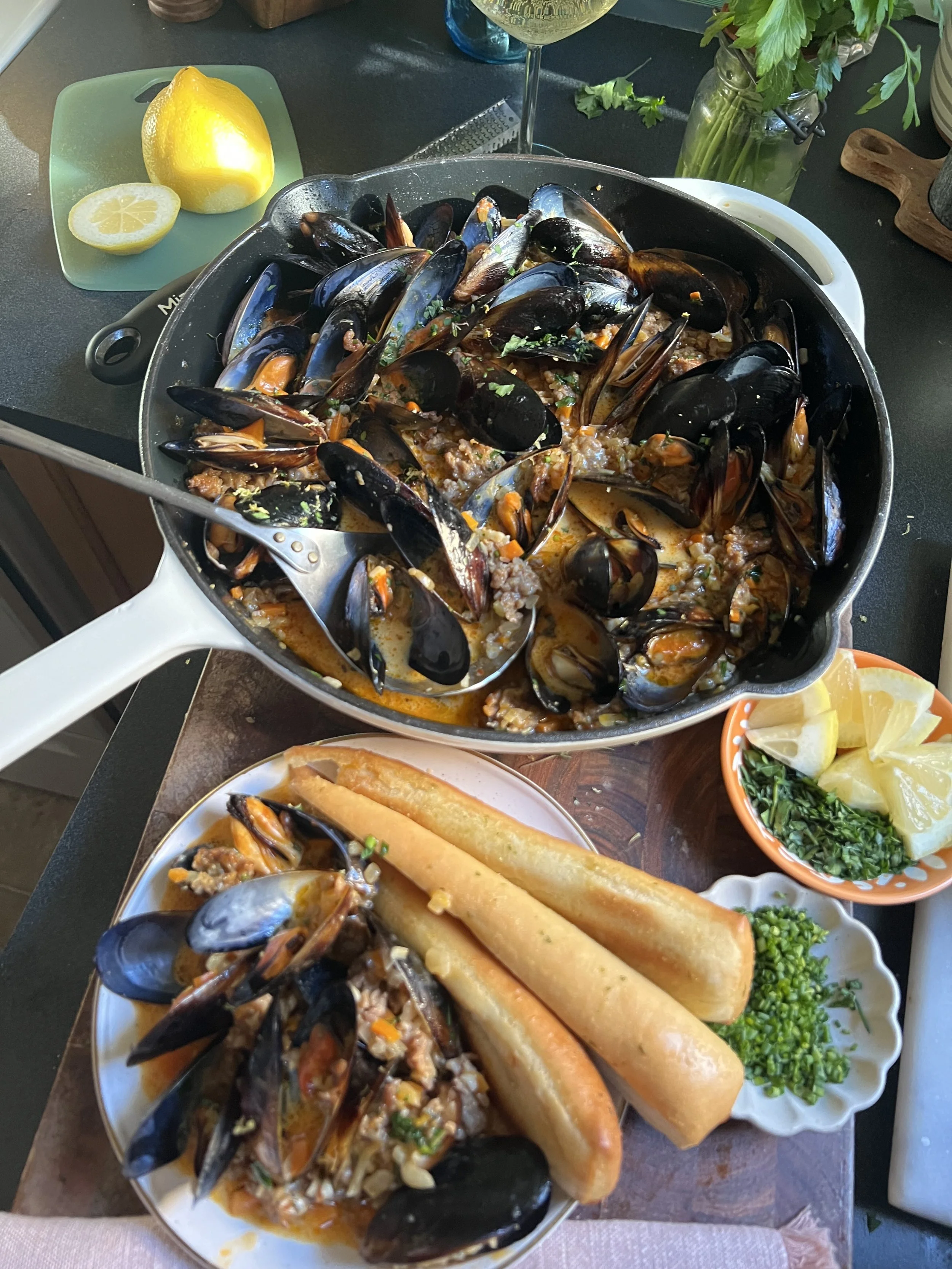 not trying to flex any muscles or show off, but these mussels are super easy to make and feel pretty lux! It’s also a great excuse to drink wine with friends and the sauce is SO SO Soooo good dipping some buttery bread in it, I really think you’ll enjoy this, espiecally if you like seafood!